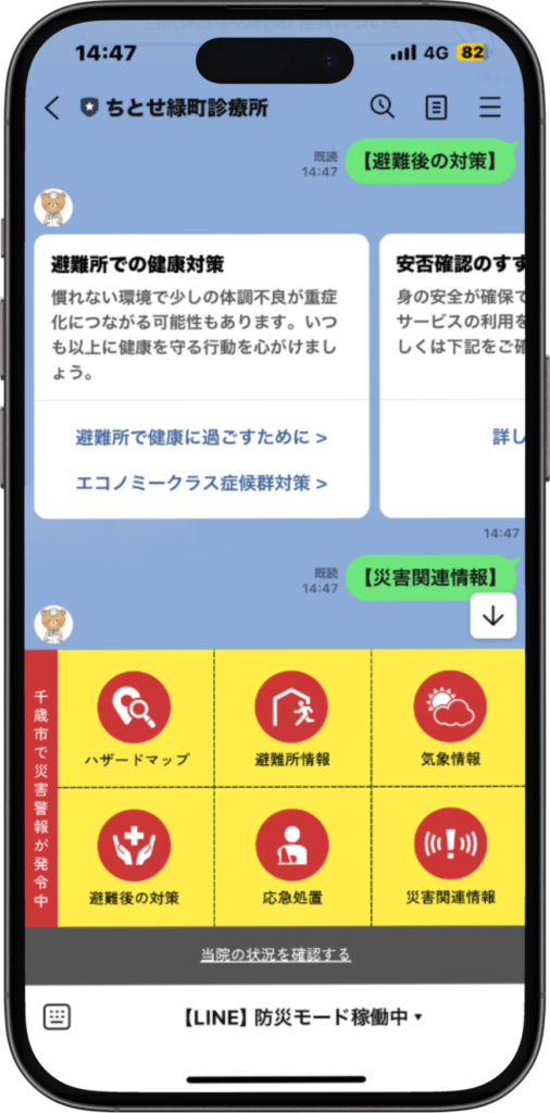 いざという時に、役立つ情報がすぐに見られるよう、この4月に緑町診療所の公式LINEアカウントに、防災モードを実装しました!